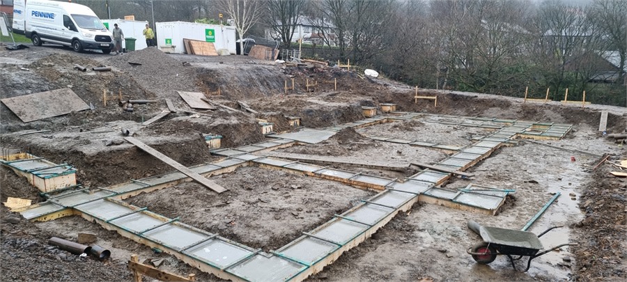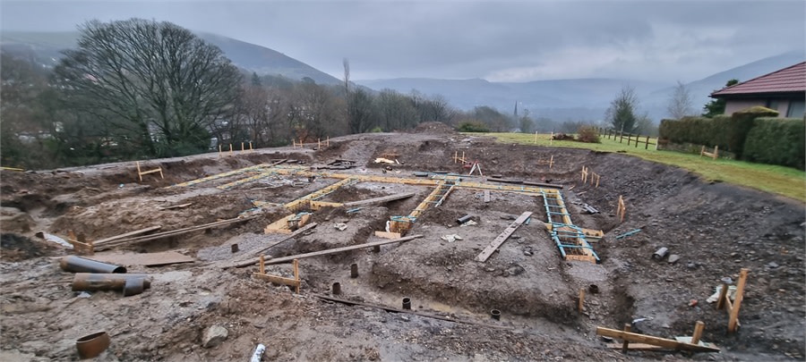 We installed the piled foundation to this large detached new build house at Grasscroft, Oldham in December 2021. A total of 78 piles to 6m deep and 130 metres of concrete ground beams went in over 4 weeks.