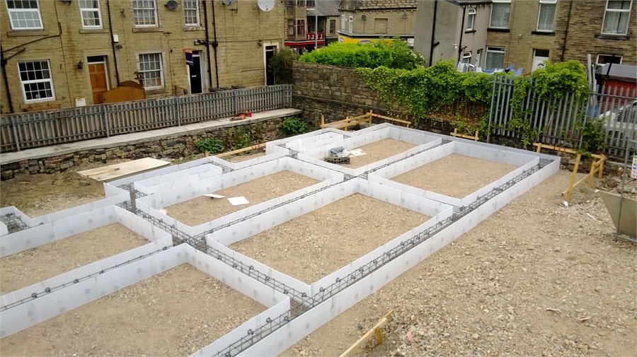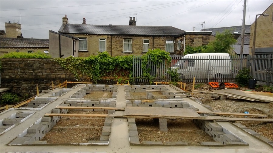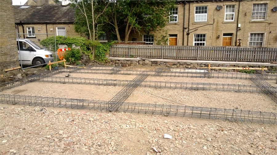 The piled foundations to this row of 4 town houses on Victoria St, Halifax took around 3 weeks to install. As can be seen from the photos this involved putting in the piles and steel above ground and then fixing shuttering prior to pouring concrete.